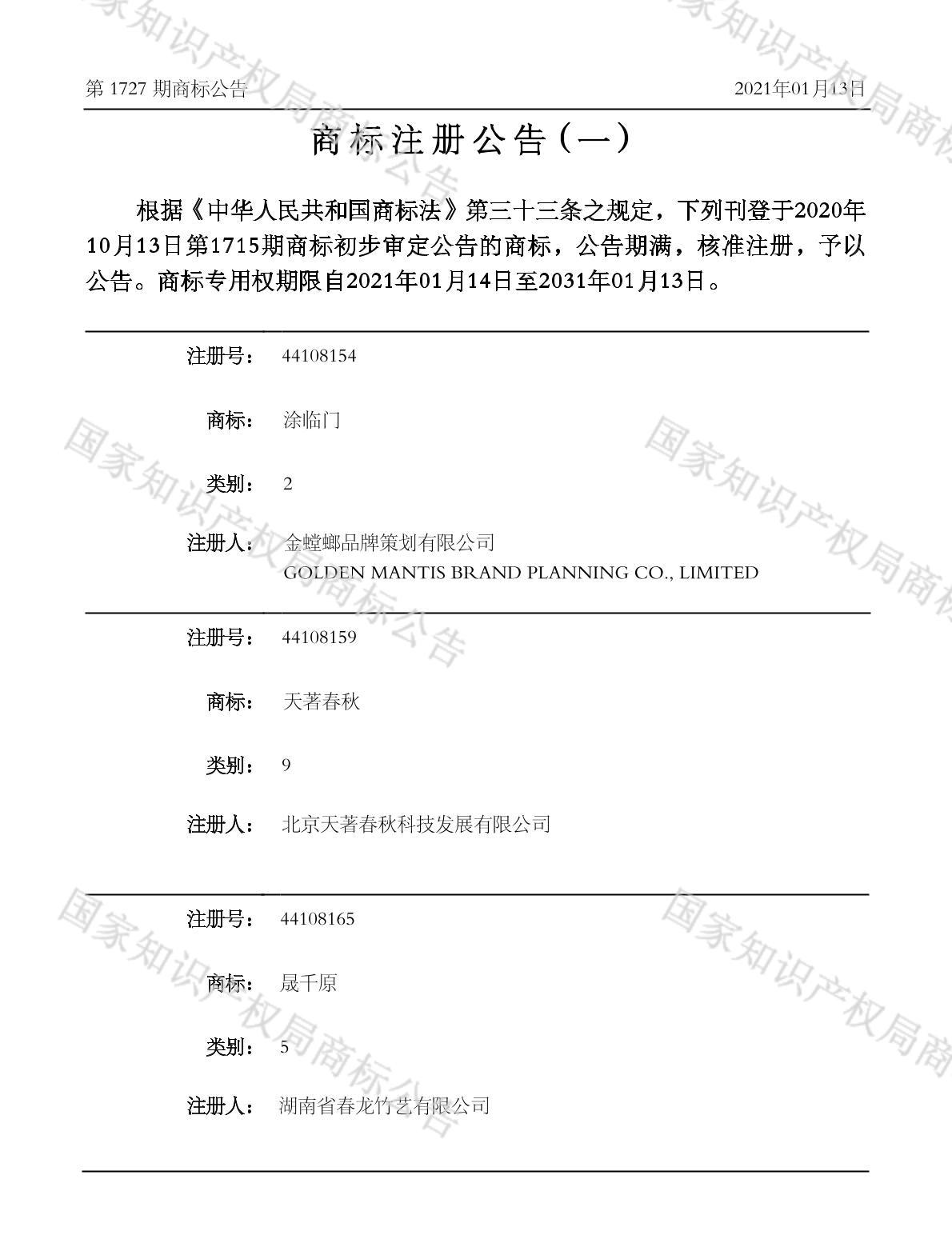 注册公告期号:1727