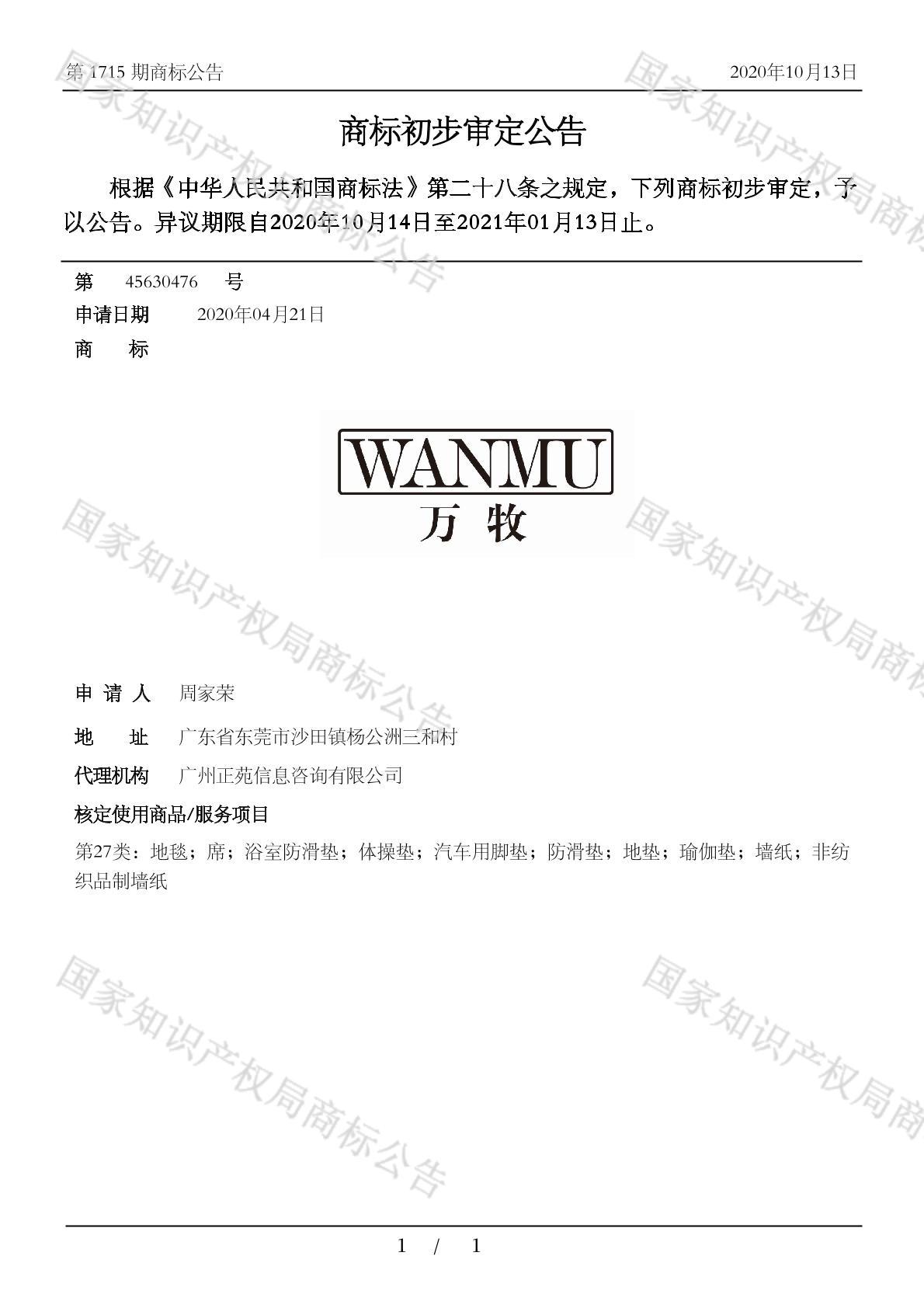 有效期限:2031-01-13 组合类型:中文注册号:45630476
