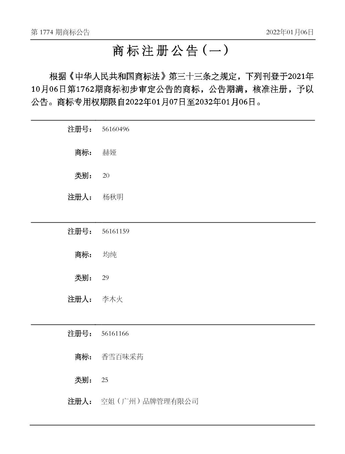 注册公告期号:1774