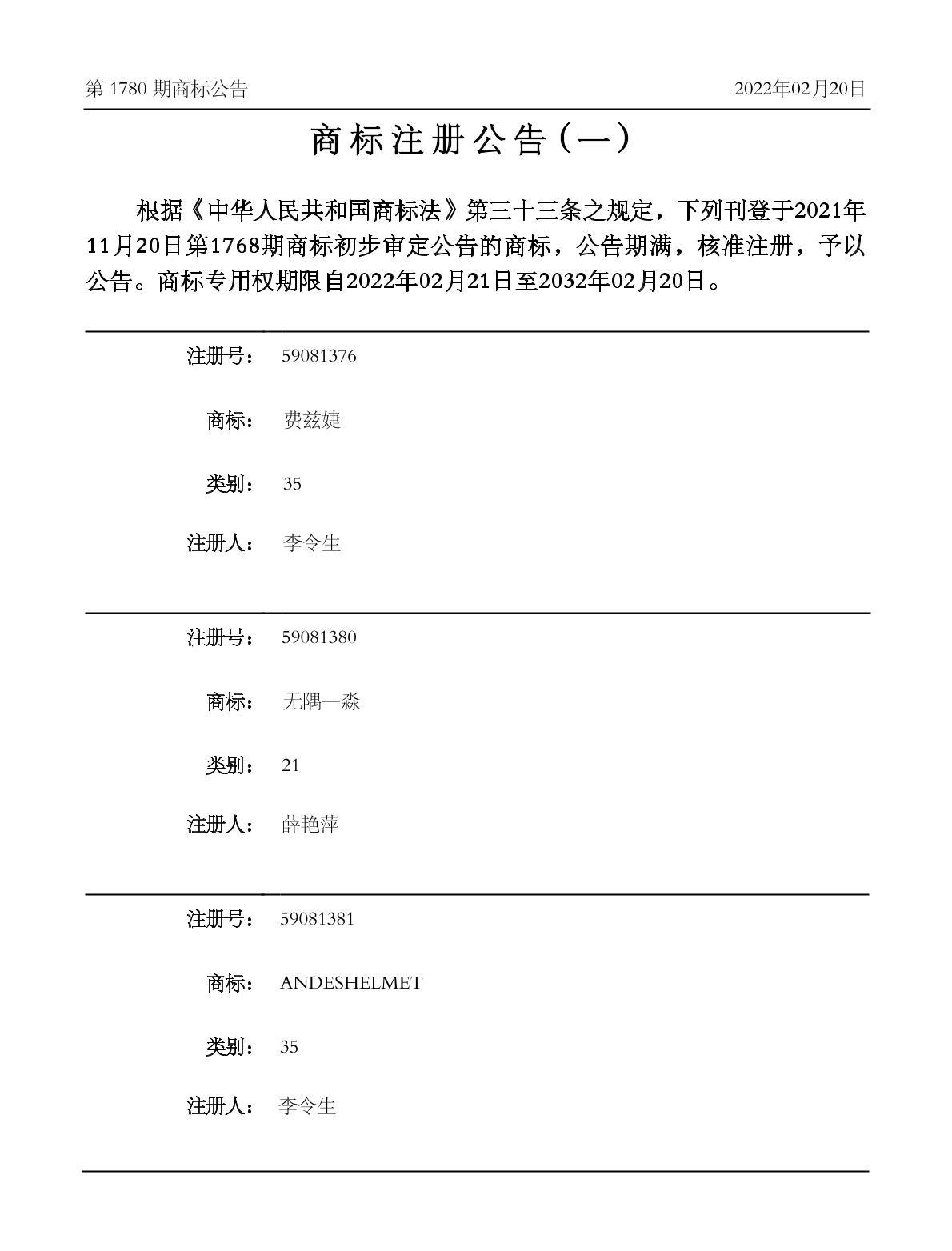 有效期限:2032-02-20 组合类型:中文注册号:59081376