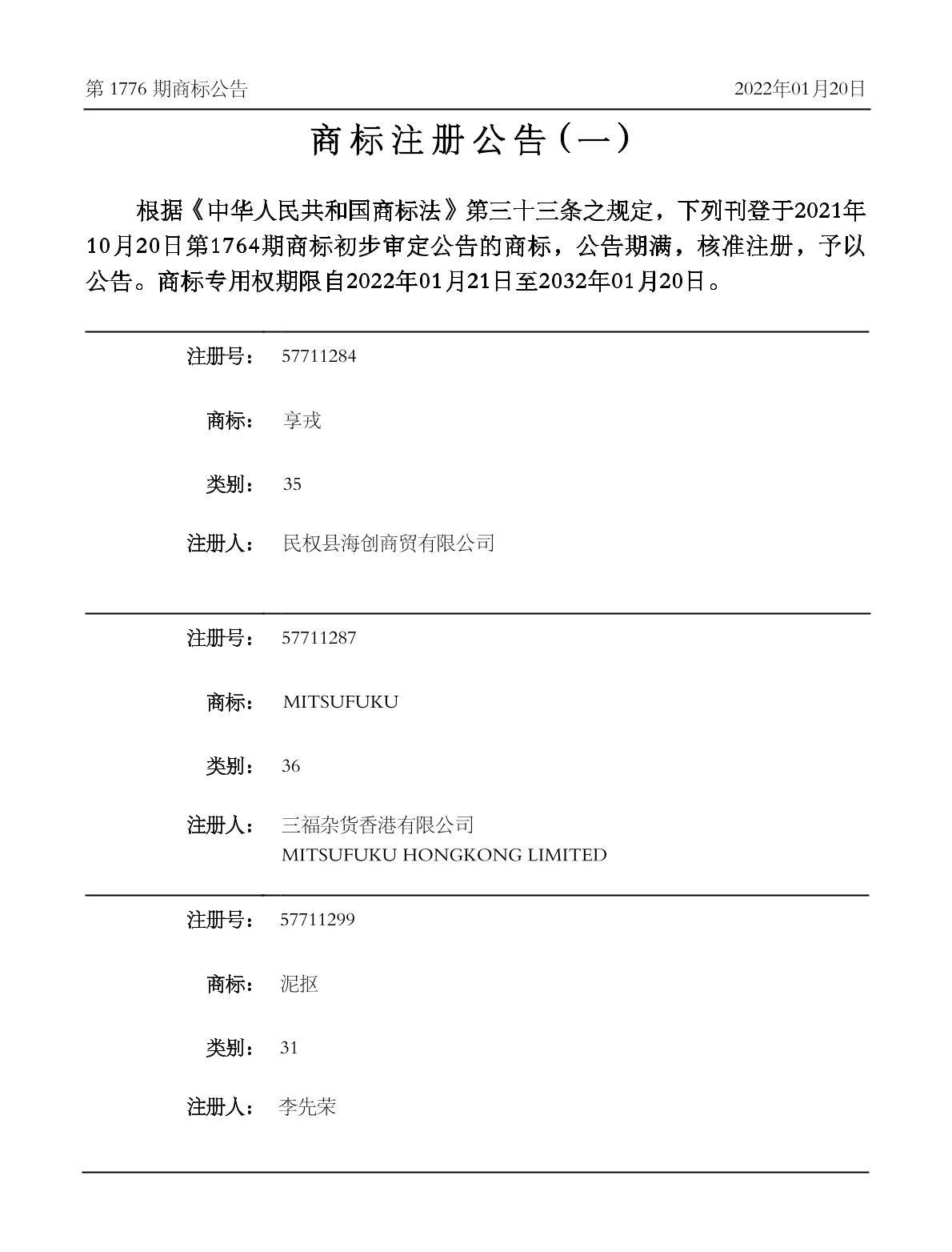 注册公告期号:1776