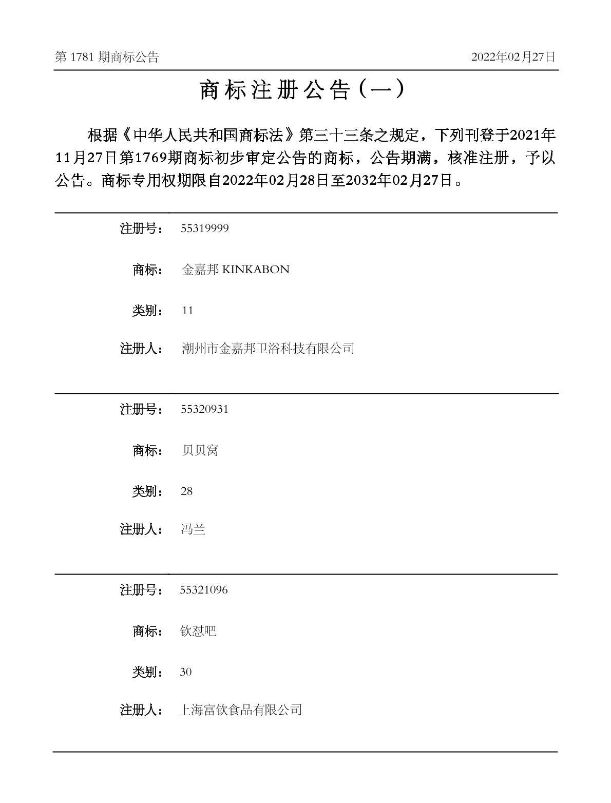 有效期限:2032-02-27 组合类型:中文注册号:55320931