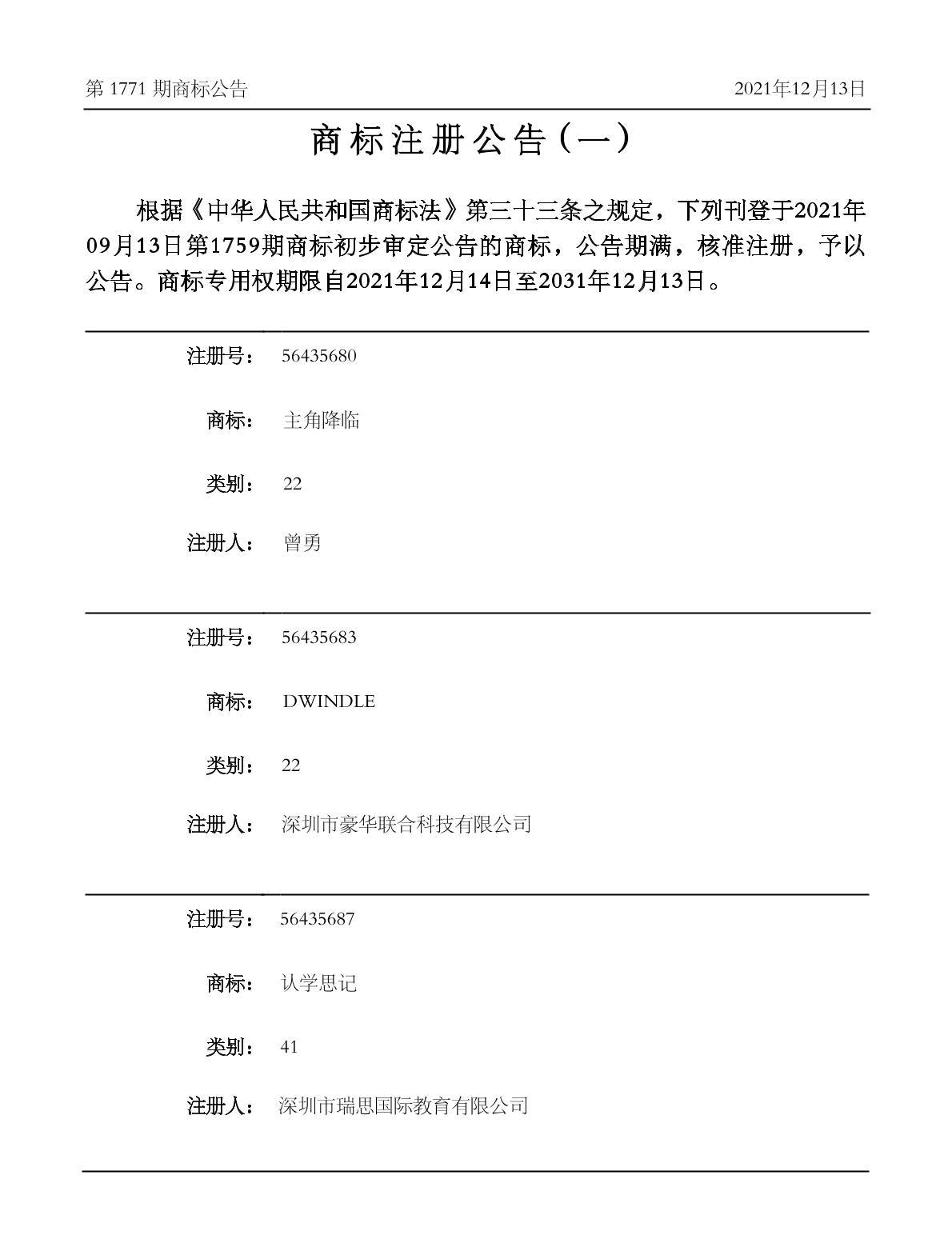 注册公告期号:1771