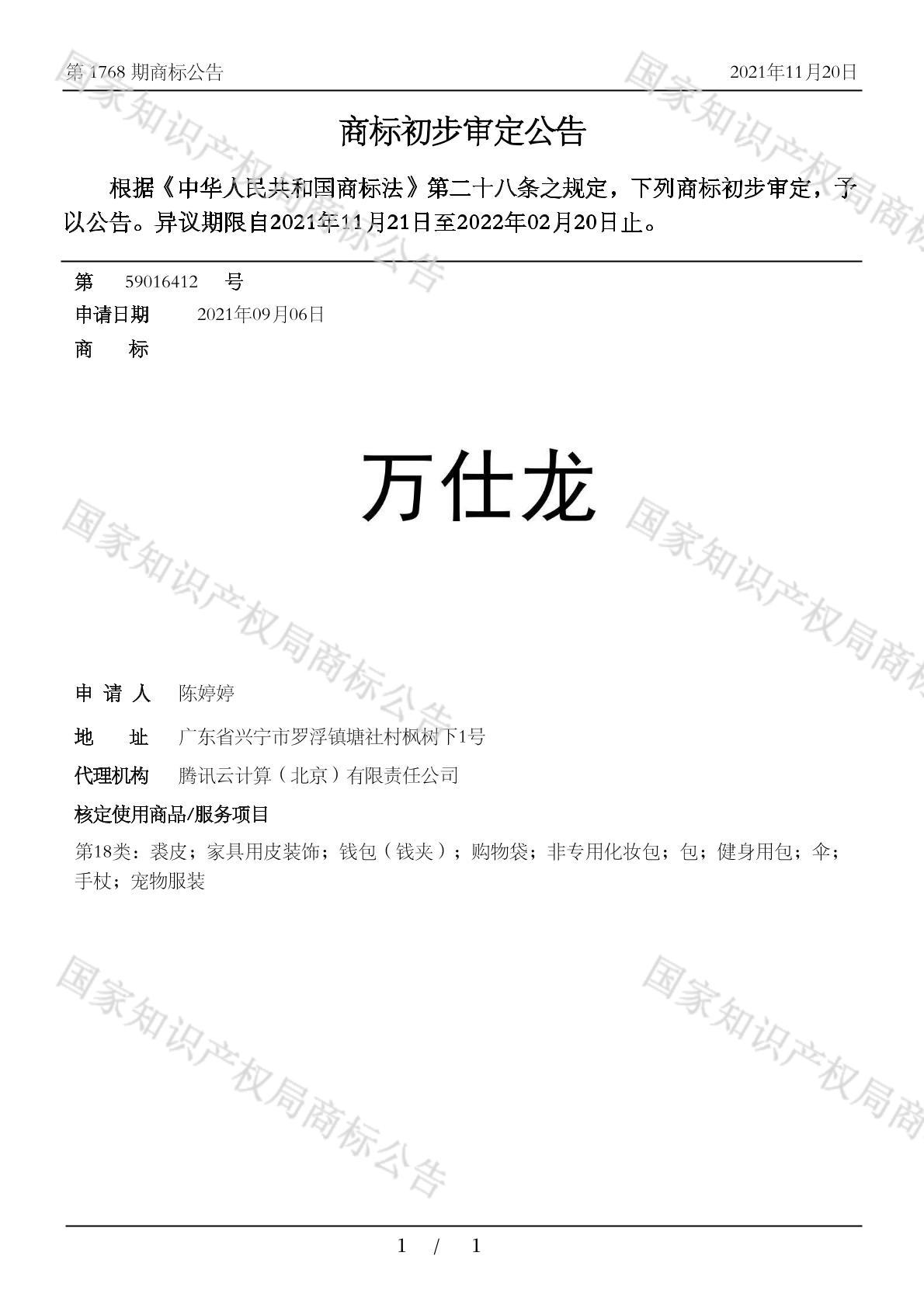 有效期限:2032-02-20 组合类型:中文注册号:59016412