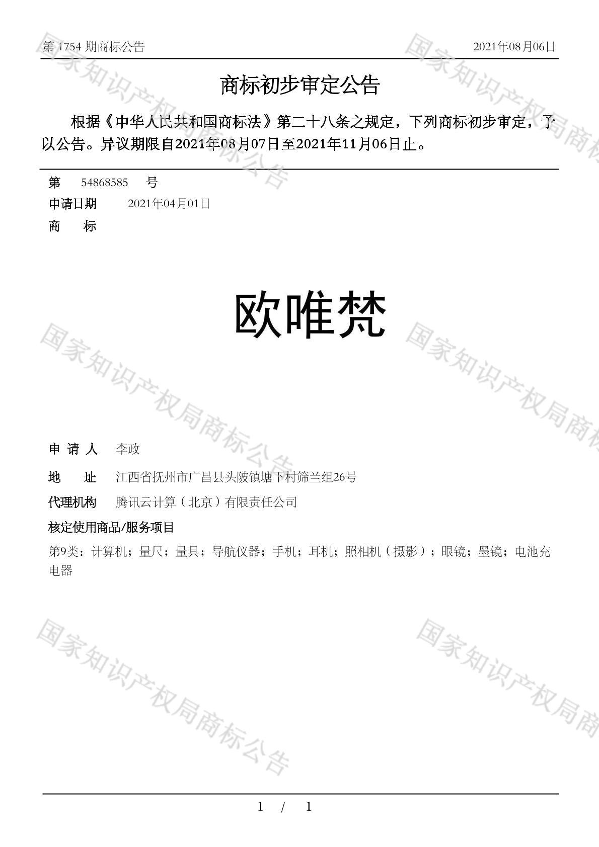 有效期限:2031-11-06 组合类型:中文注册号:54868585