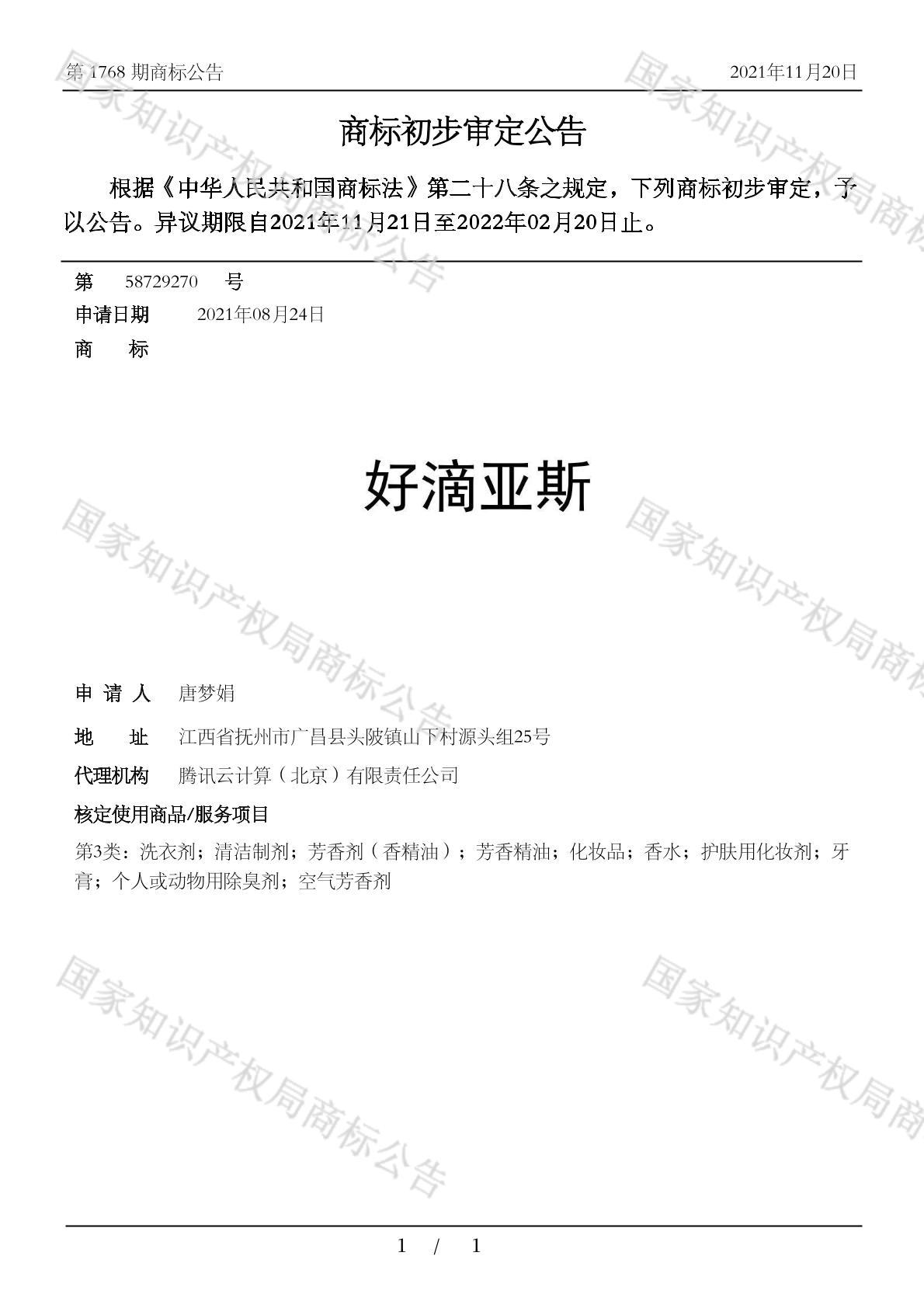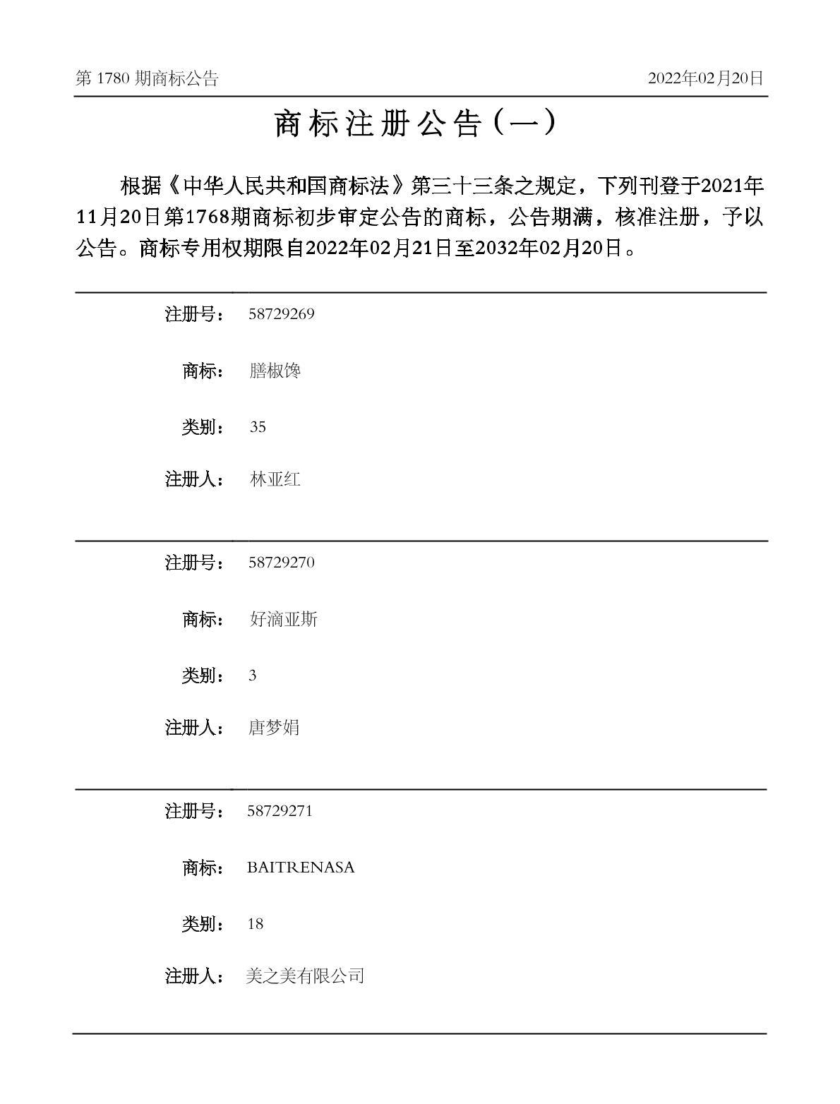 有效期限:2032-02-20 组合类型:中文注册号:58729270