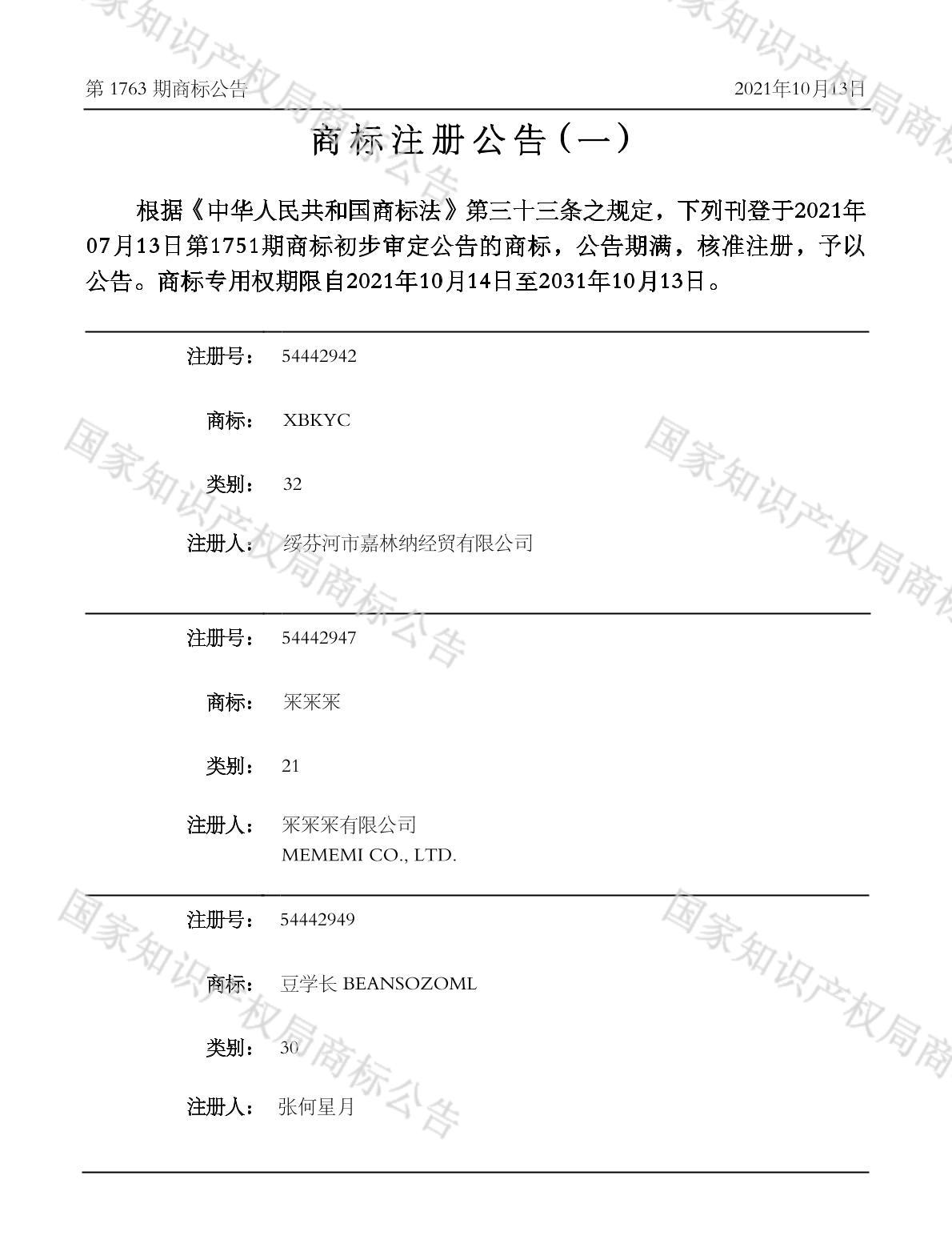 有效期限:2031-10-13 组合类型:中文注册号:54442949
