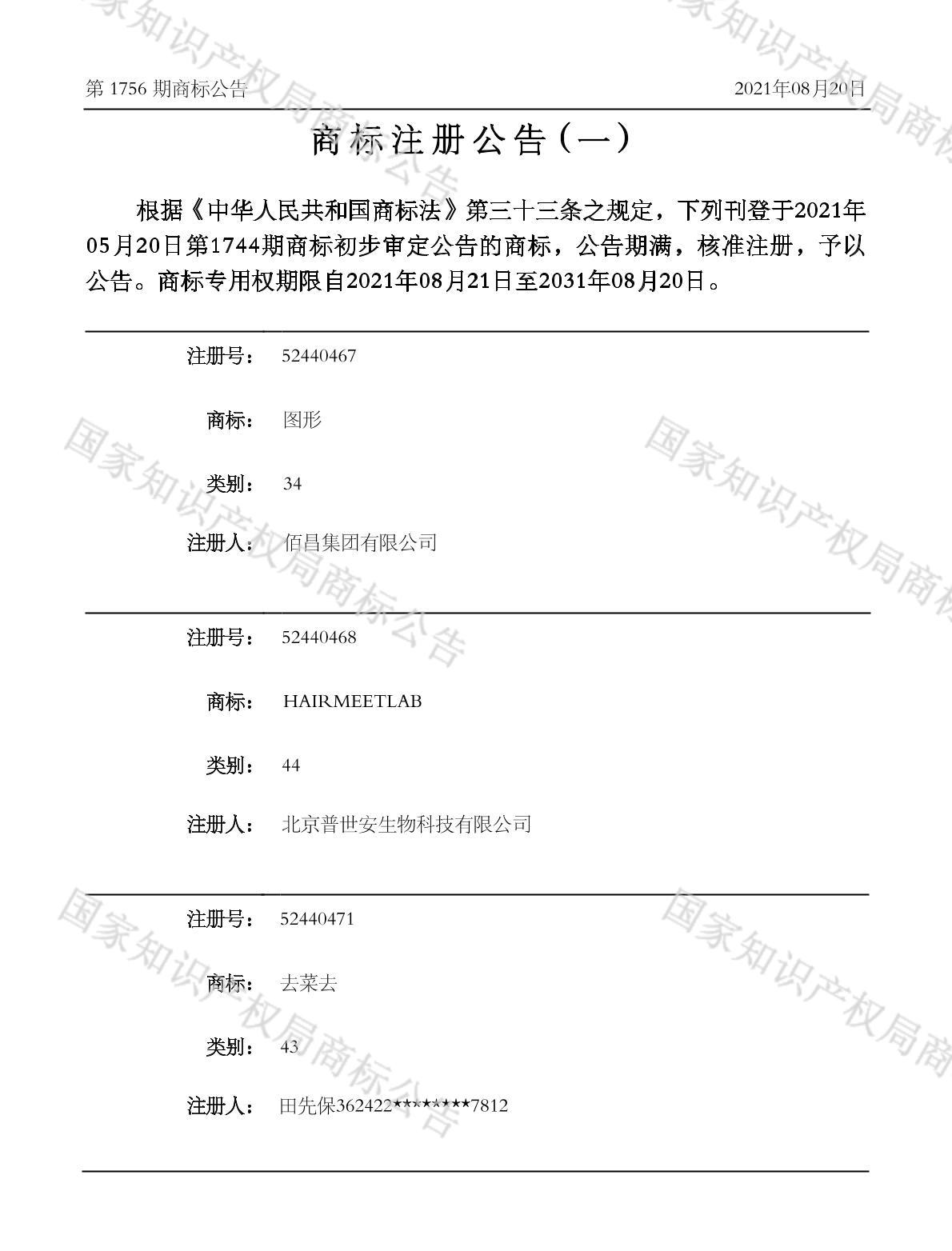 有效期限:2031-08-20 组合类型:中文注册号:52430933