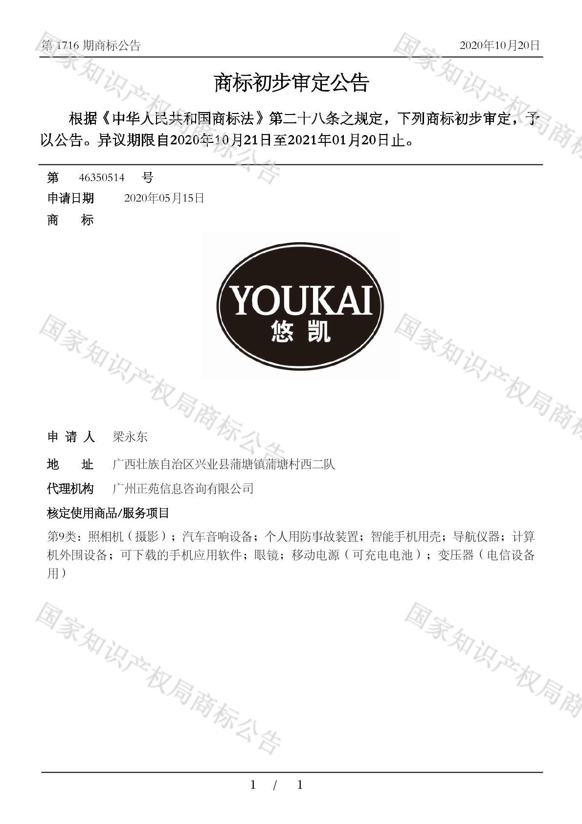 有效期限:2031-01-20 组合类型:中文注册号:46350514