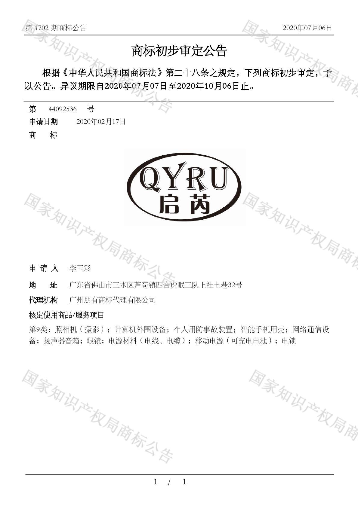 有效期限:2030-10-06 组合类型:中文注册号:44092536