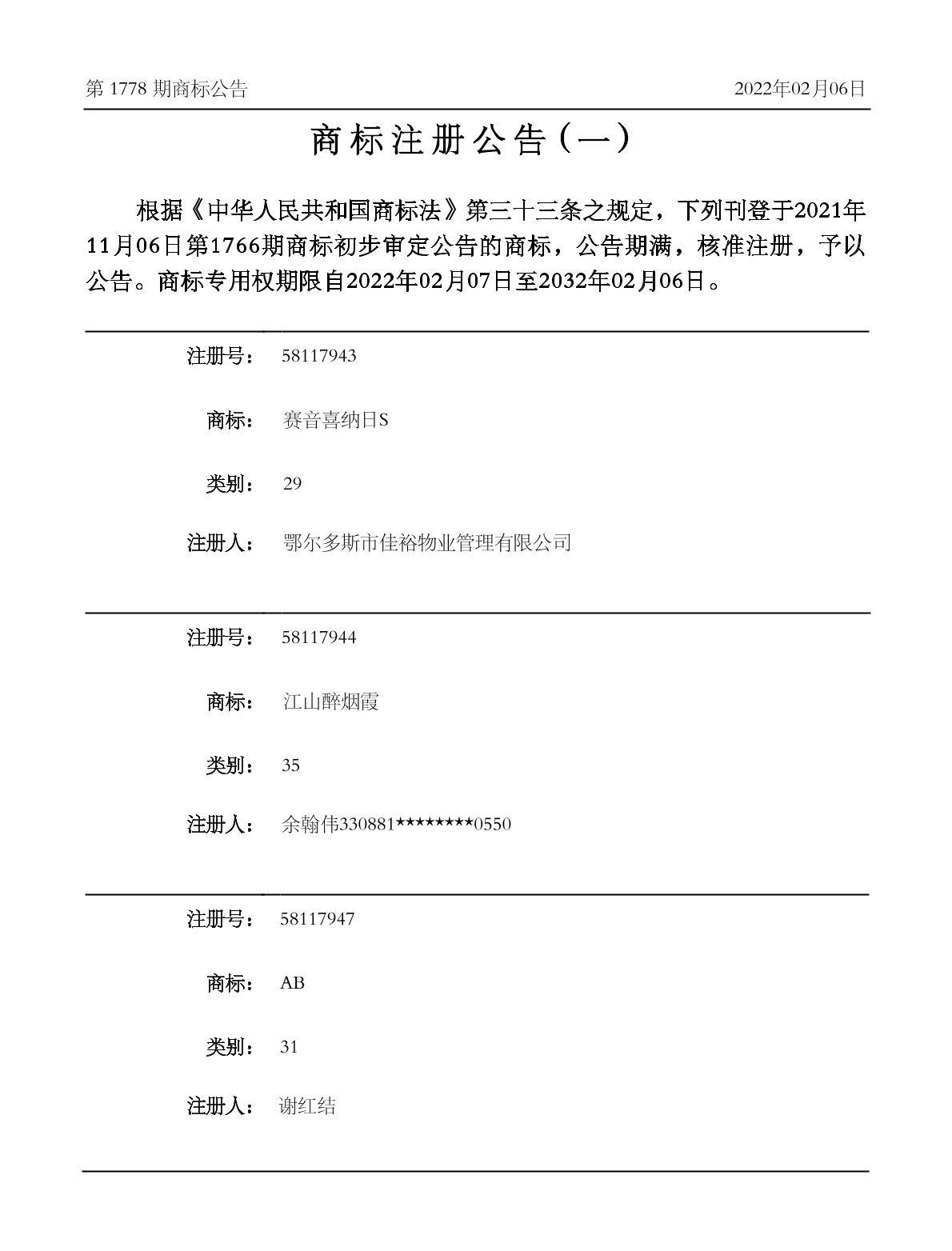 有效期限:2032-02-06 组合类型:中文注册号:58117947