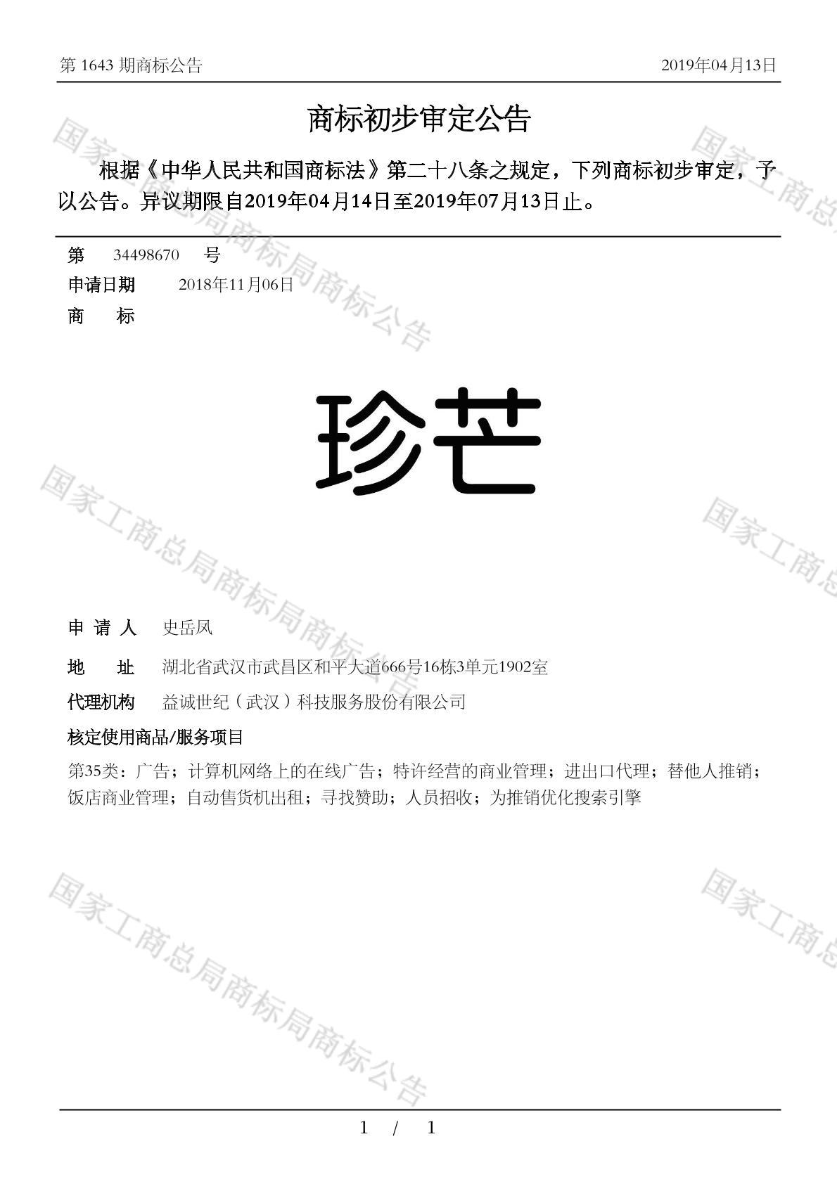 有效期限:2029-07-13 组合类型:中文注册号:34498670