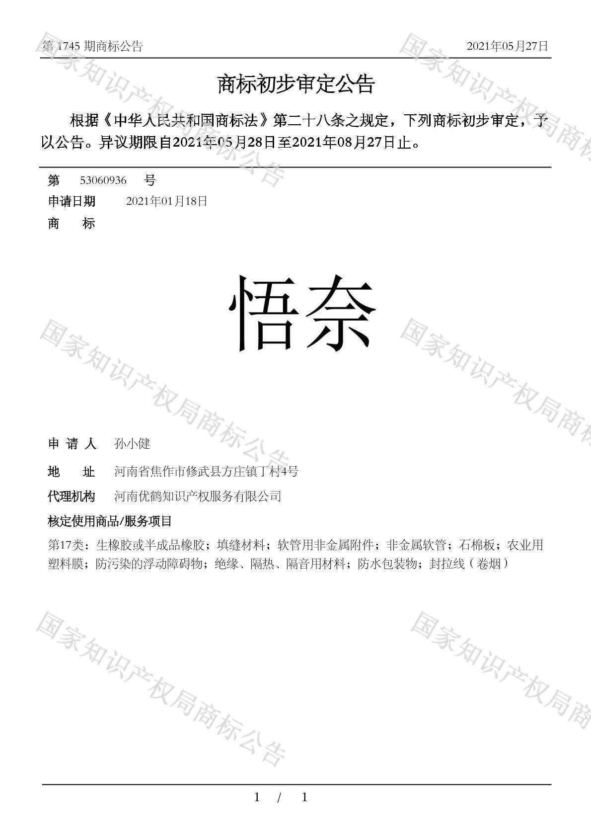 有效期限:2031-08-27 组合类型:中文注册号:53060936
