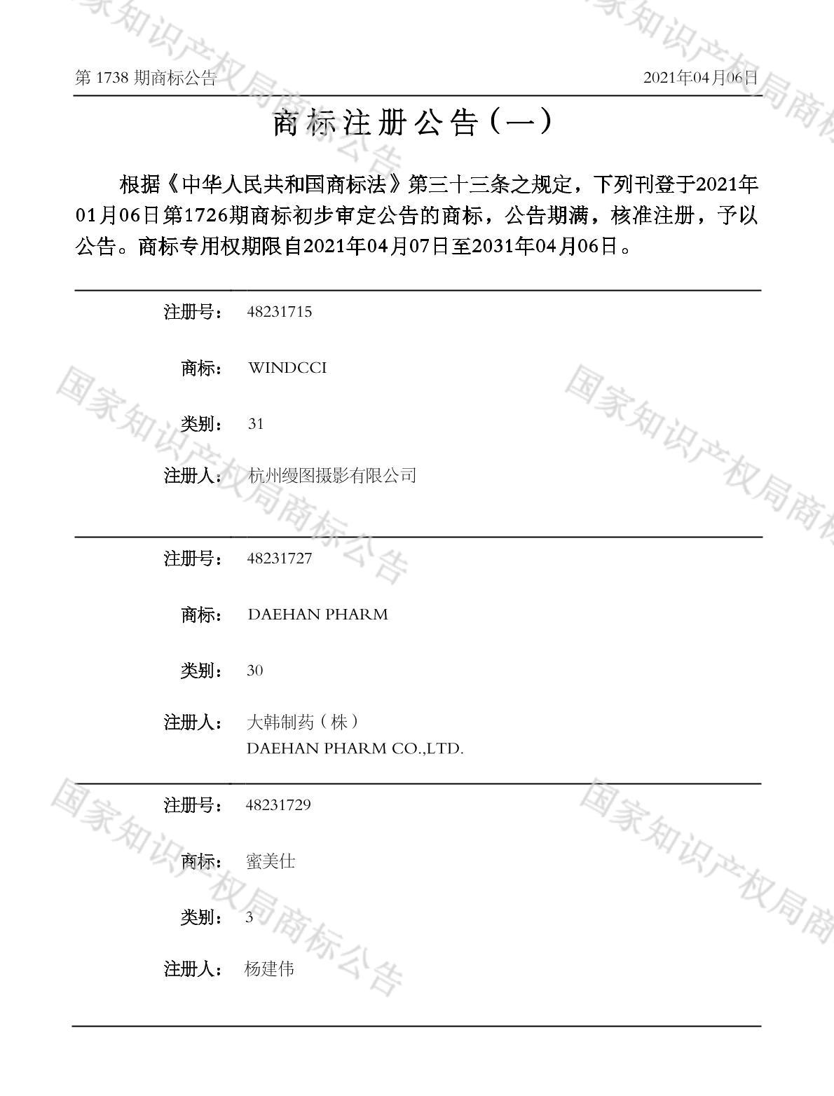 有效期限:2031-04-06 组合类型:中文注册号:48231729