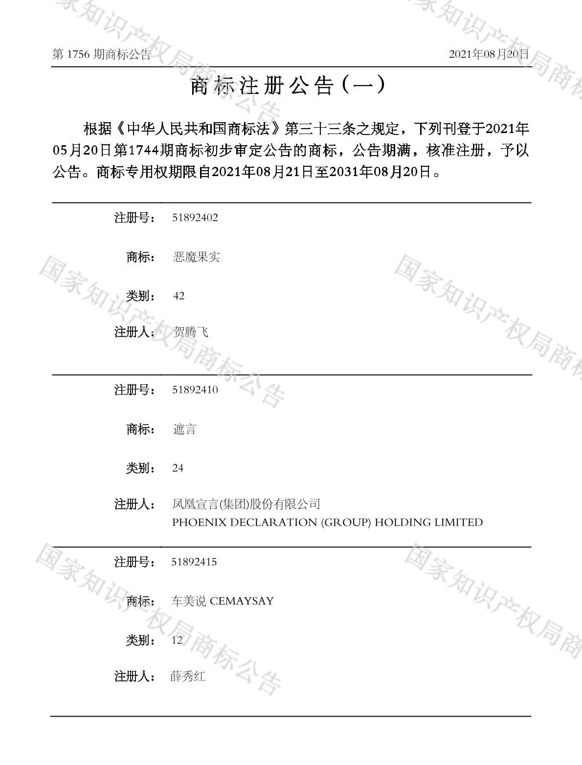 有效期限:2031-08-20 组合类型:中文注册号:51892415