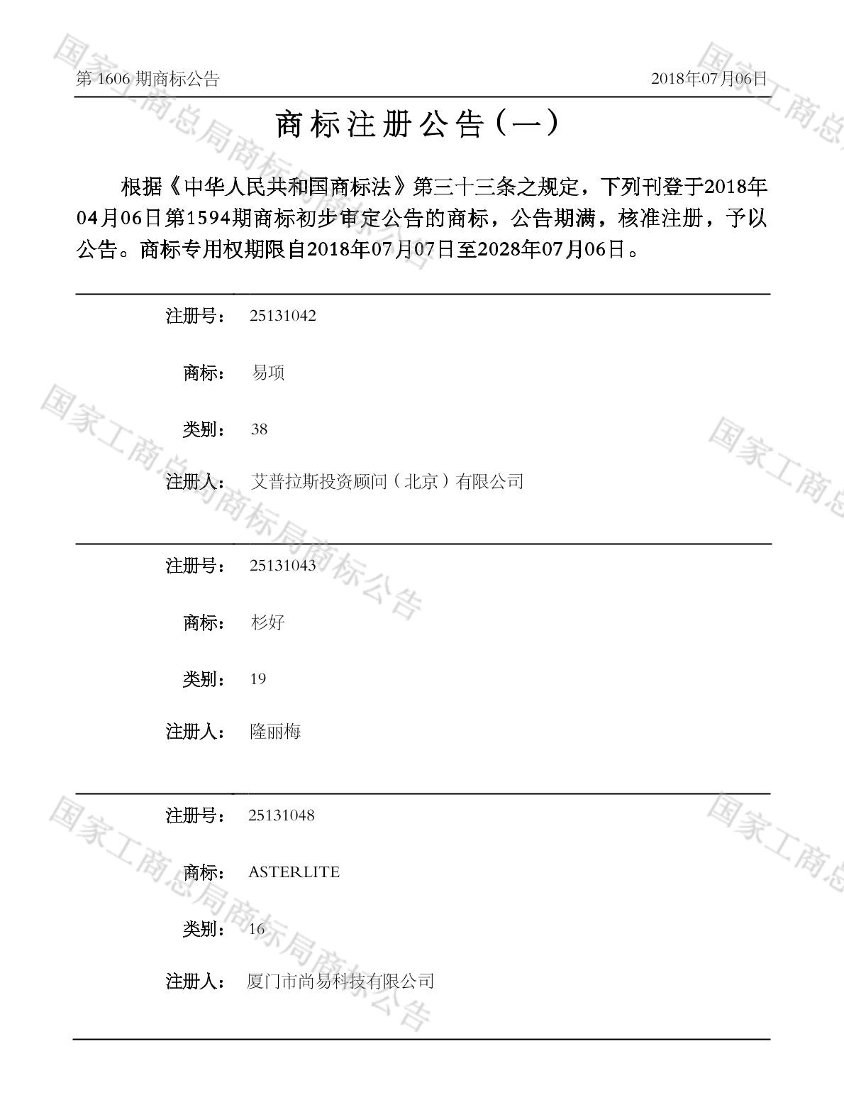 注册公告期号:1606