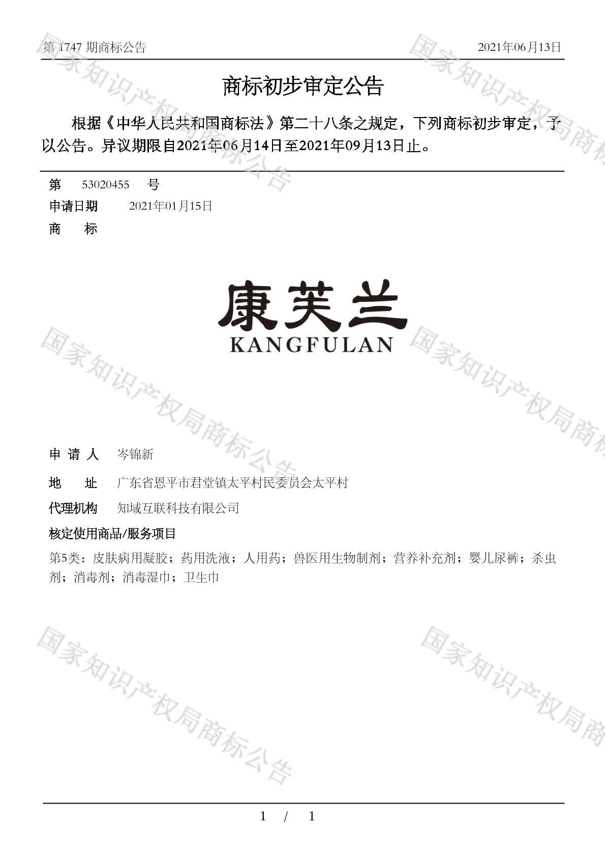 有效期限:2031-09-13 组合类型:中文注册号:53020455