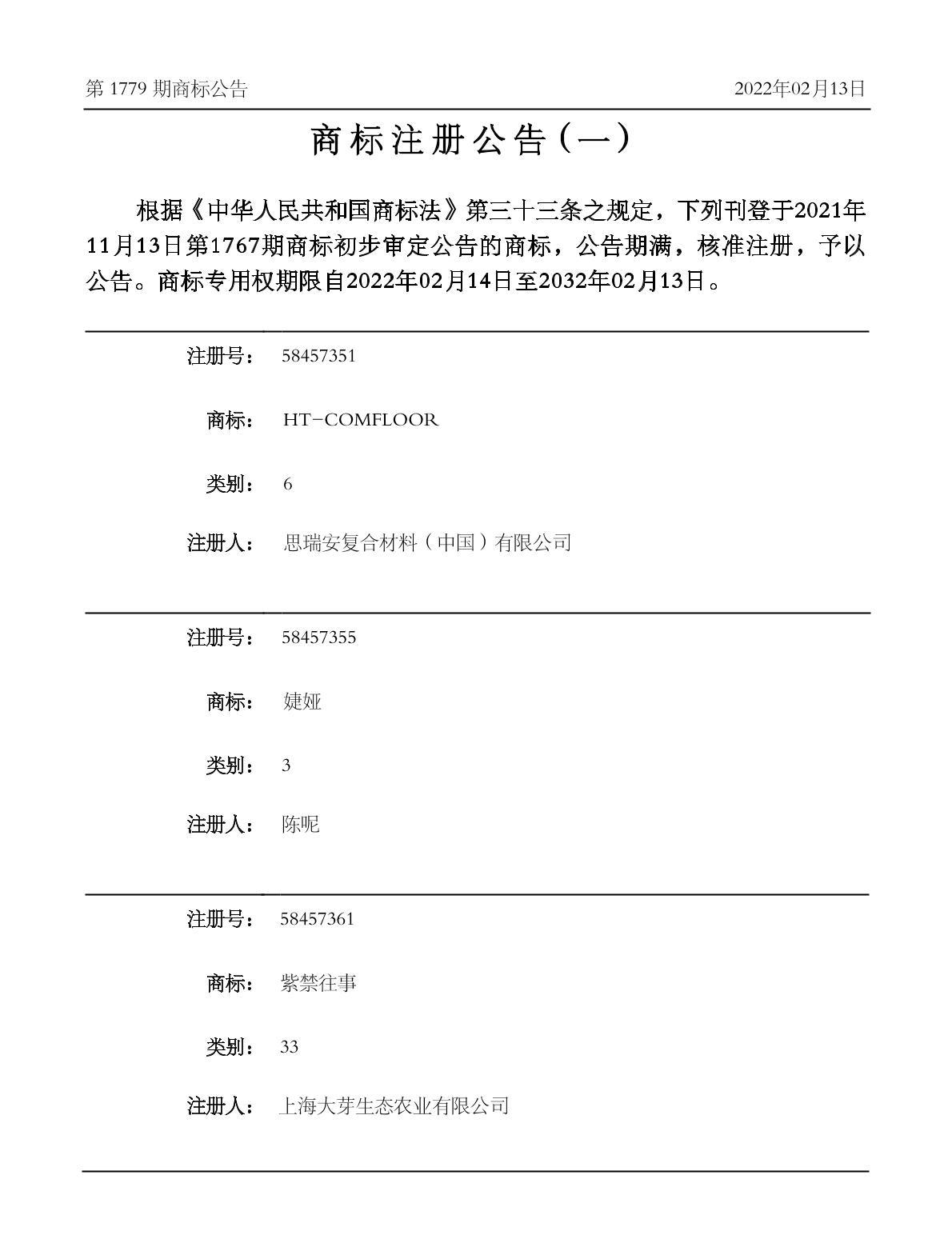 有效期限:2032-02-13 组合类型:中文注册号:58457355