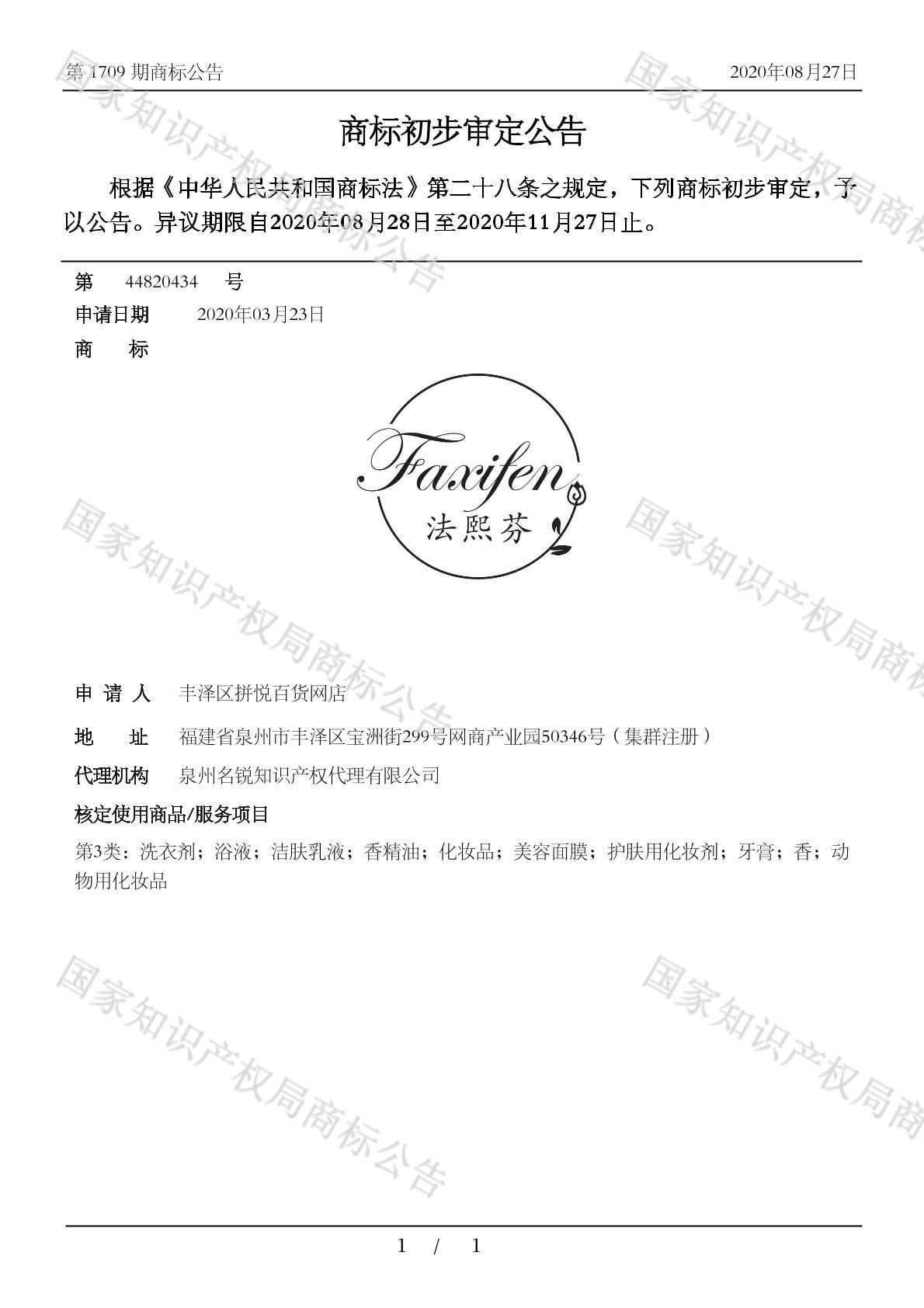 有效期限:2030-11-27 组合类型:中文注册号:44820434