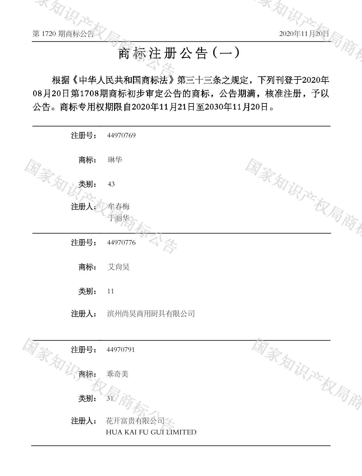 有效期限:2030-11-20 组合类型:中文注册号:44970791