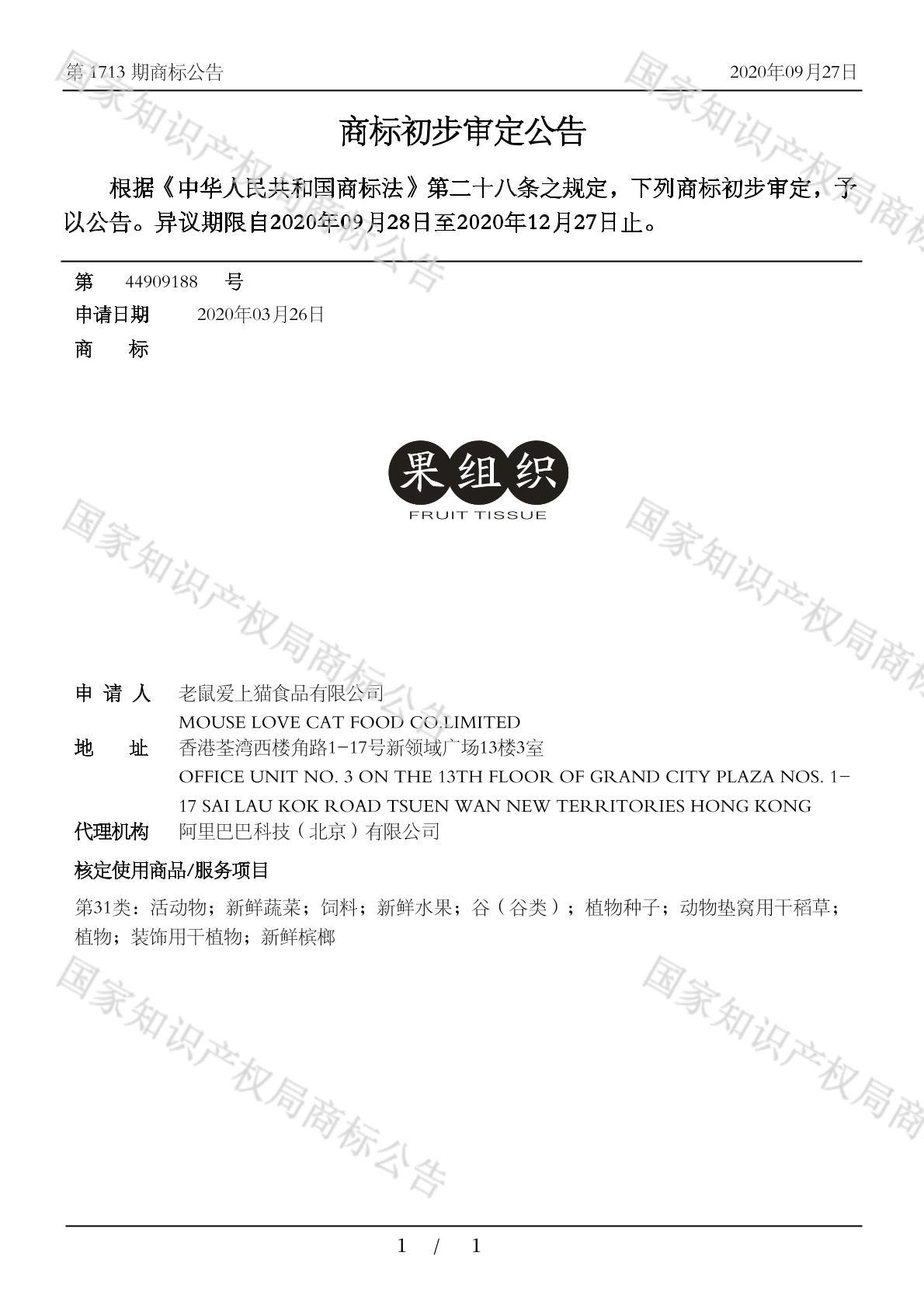 您当前位置:首页商标转让31类商标果组织 FRUIT TISSUE