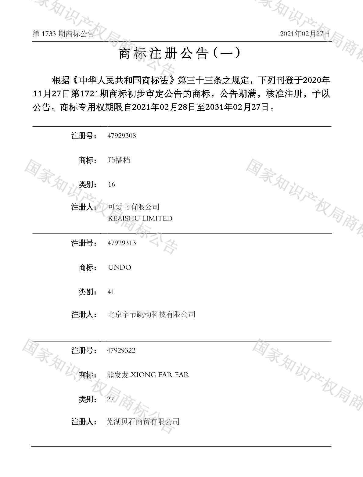 有效期限:2031-02-27 组合类型:中文注册号:47929308