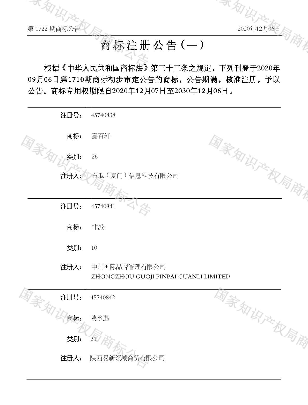 注册公告期号:1722