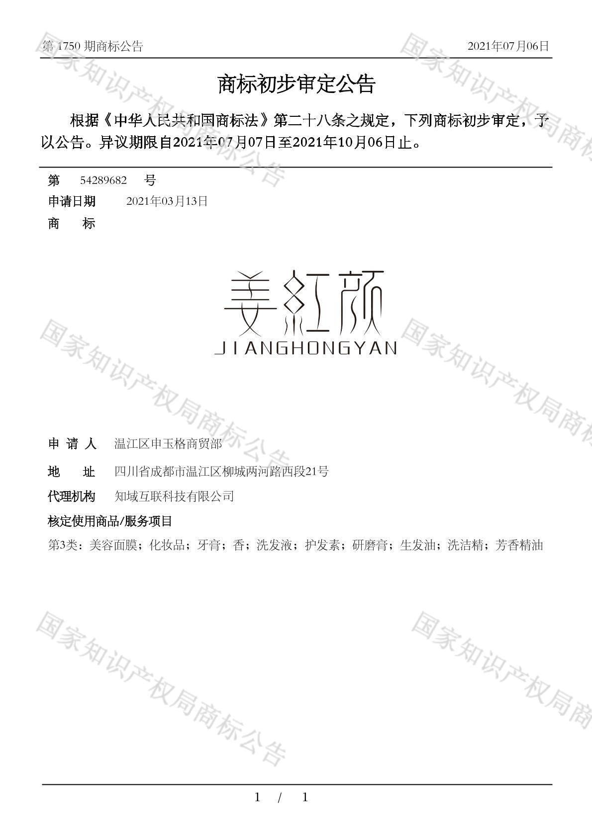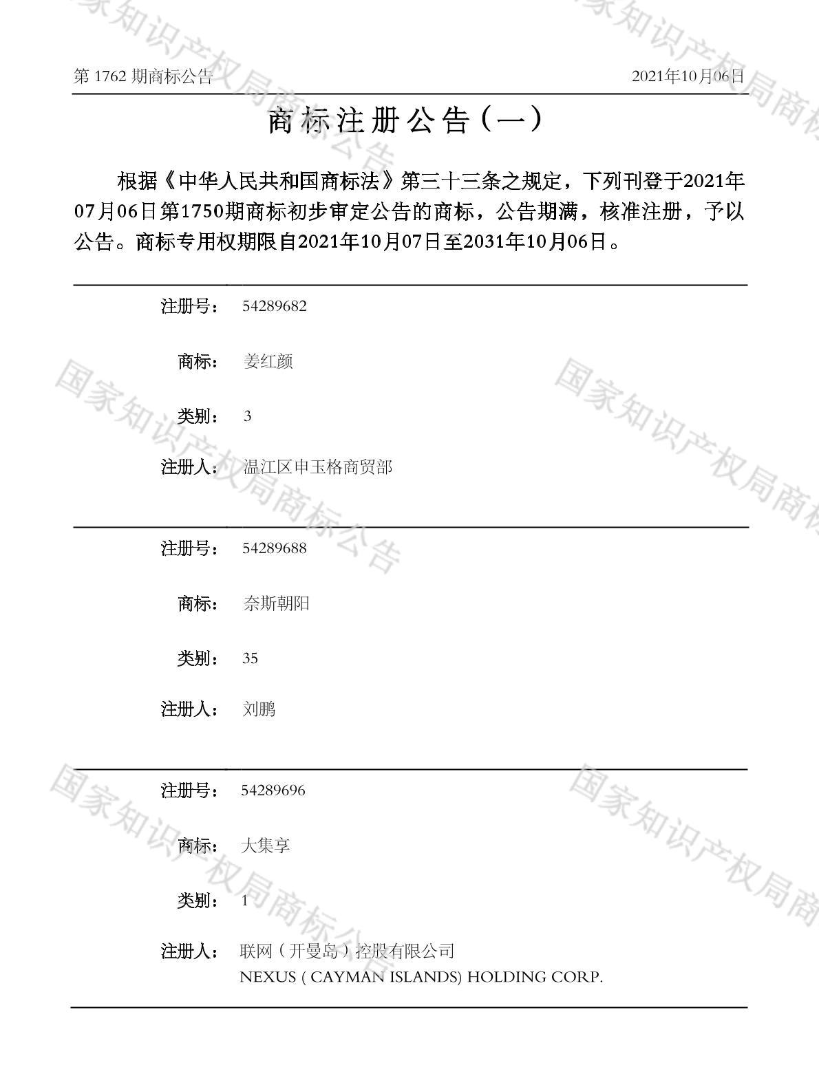有效期限:2031-10-06 组合类型:中文注册号:54289682