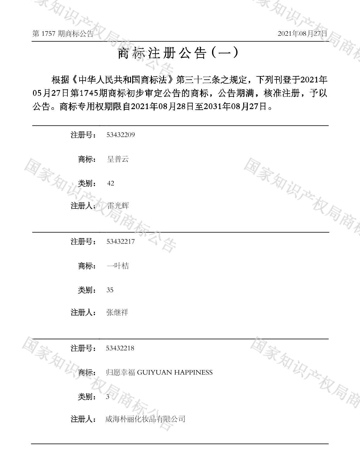 有效期限:2031-08-27 组合类型:中文注册号:53432209