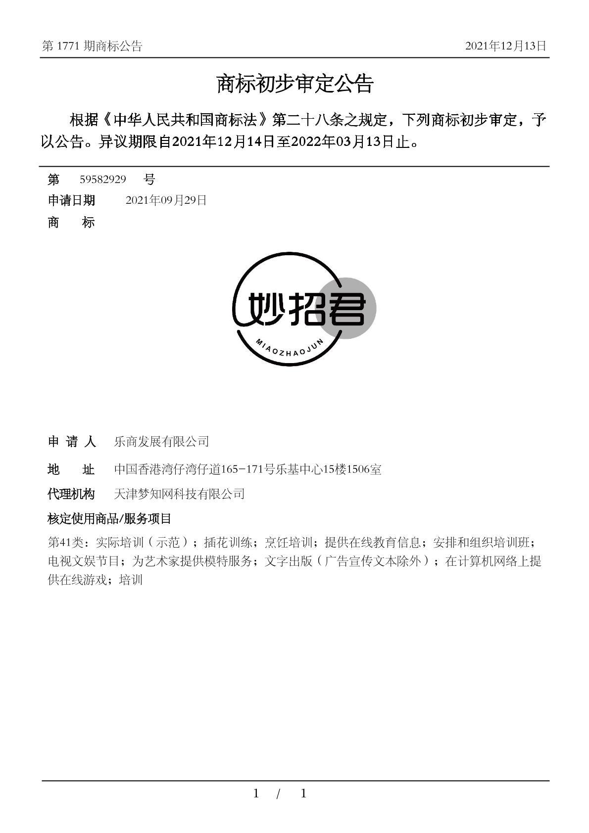 有效期限:2032-03-13 组合类型:中文注册号:59582929