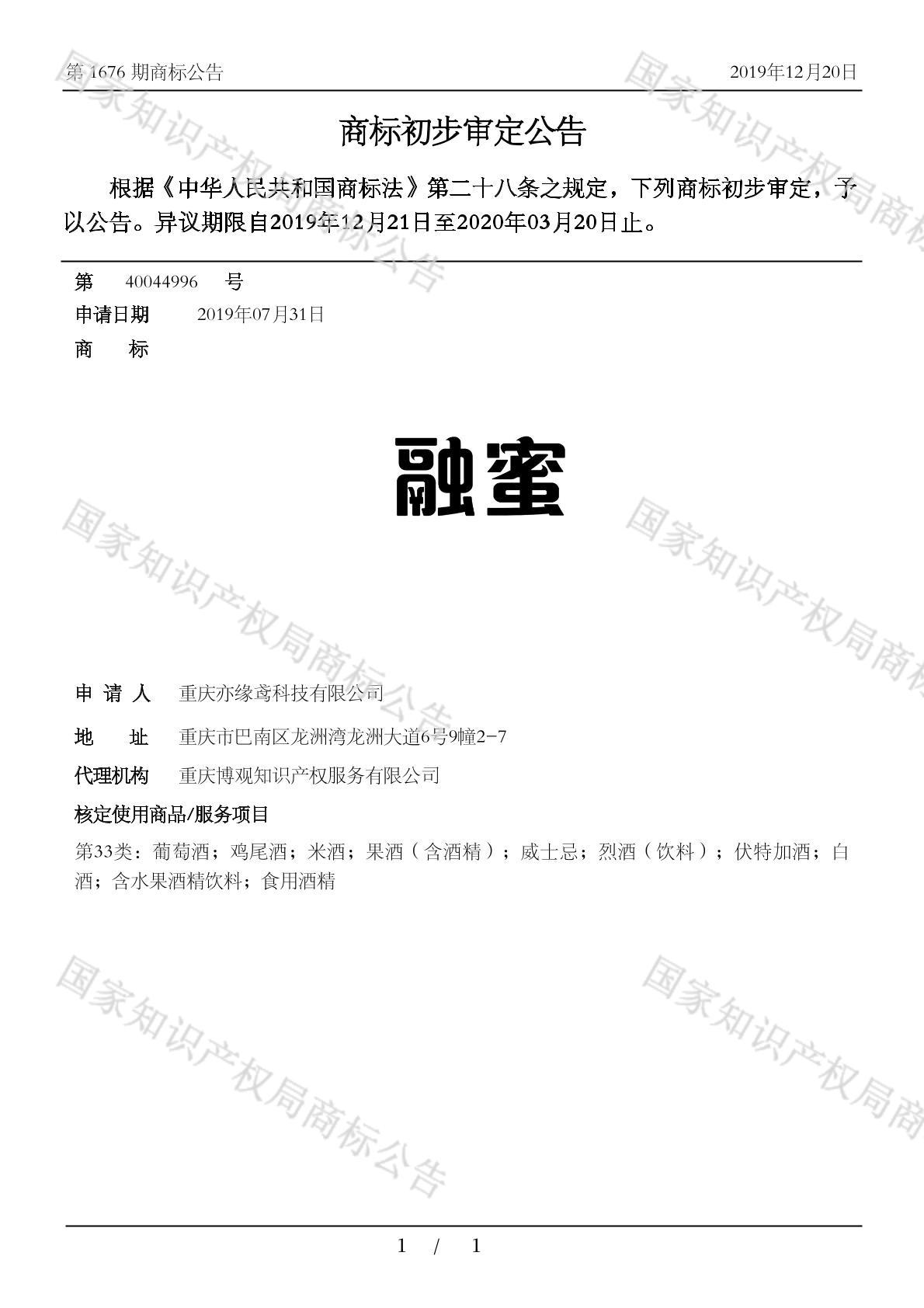 您当前位置:首页商标转让33类商标融蜜