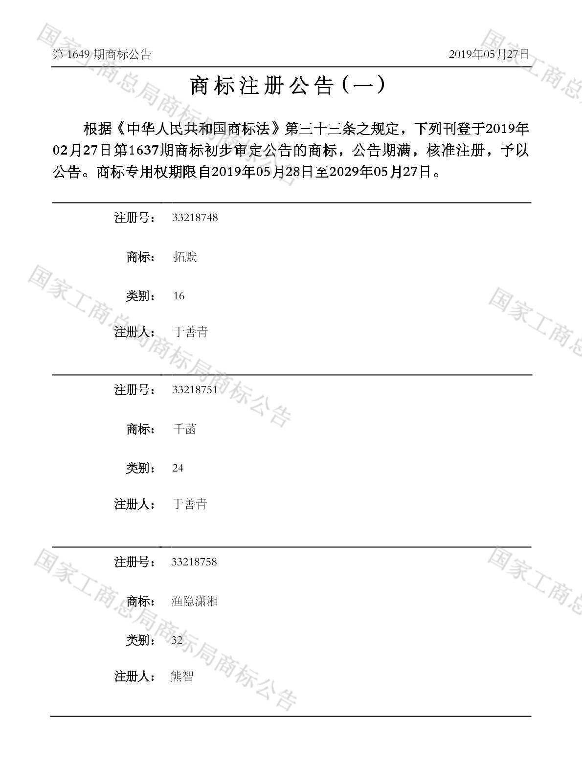 有效期限:2029-05-27 组合类型:中文注册号:33218748