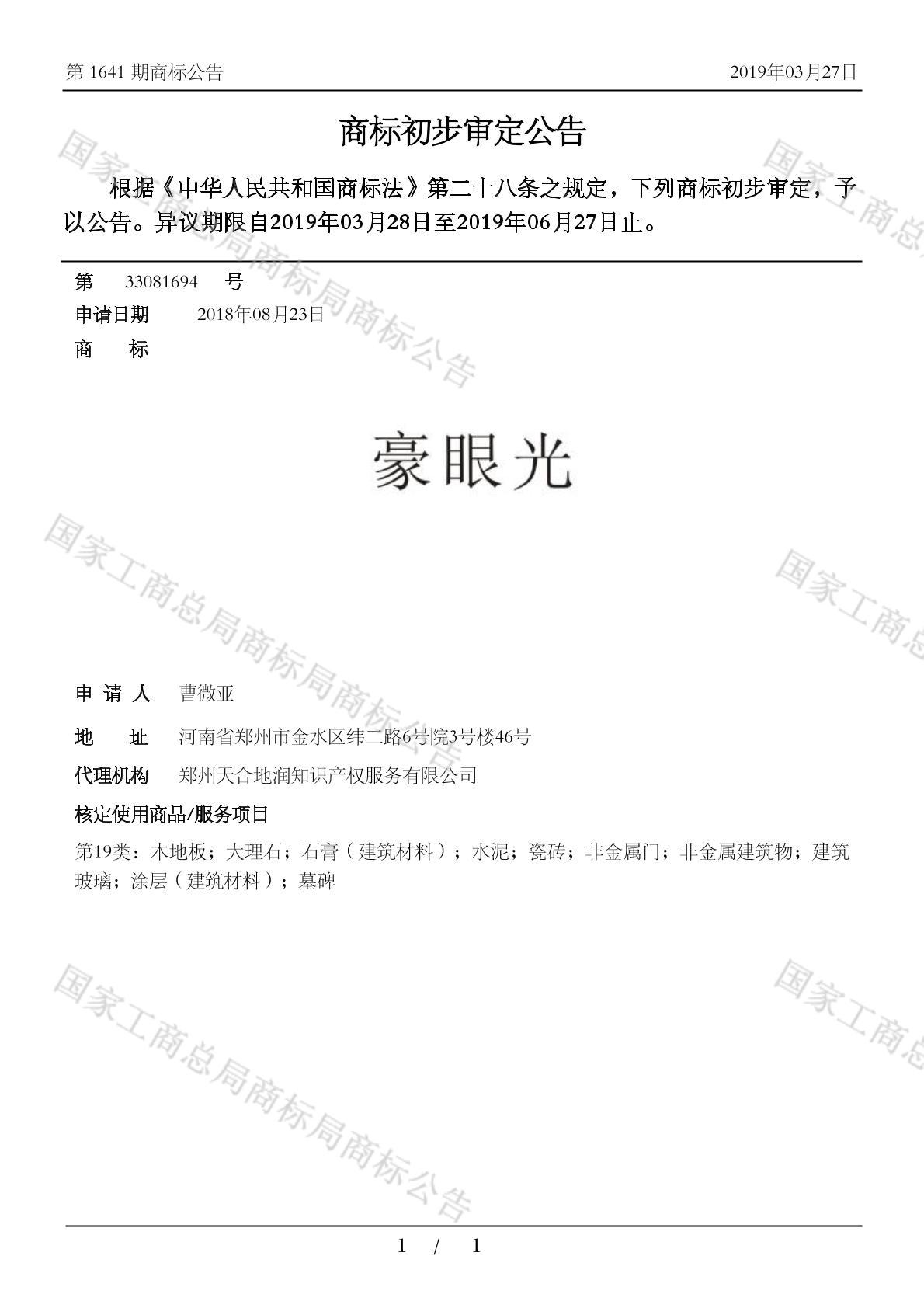 您当前位置:首页商标转让19类商标豪眼光