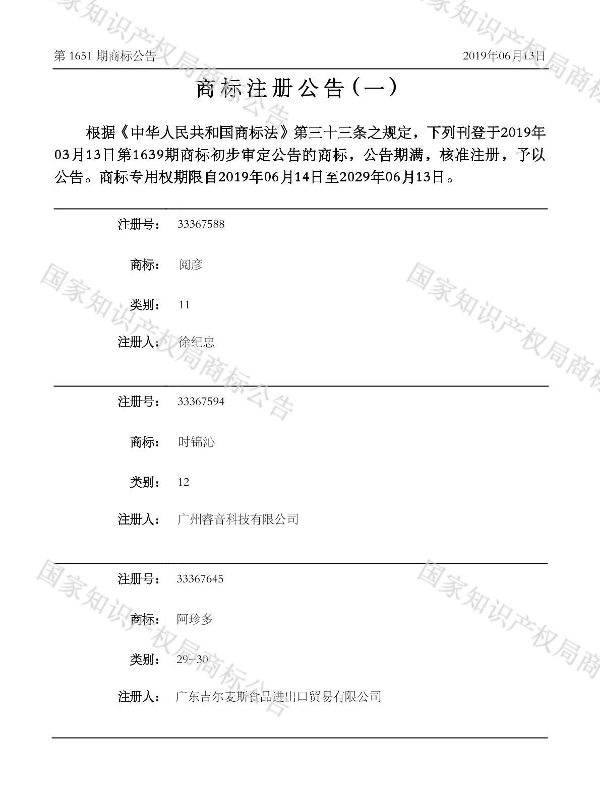 注册公告期号:1651